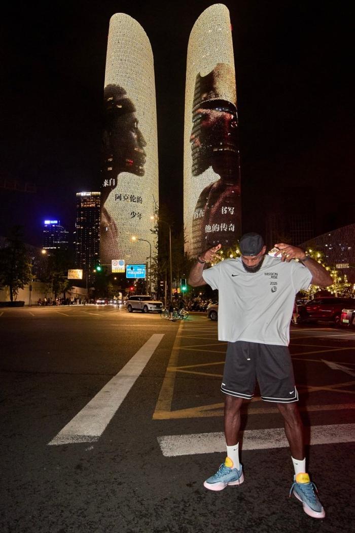 开云体育官网-亲自打卡留念!耐克官方晒詹姆斯昨晚在成都双子塔灯光秀前合影