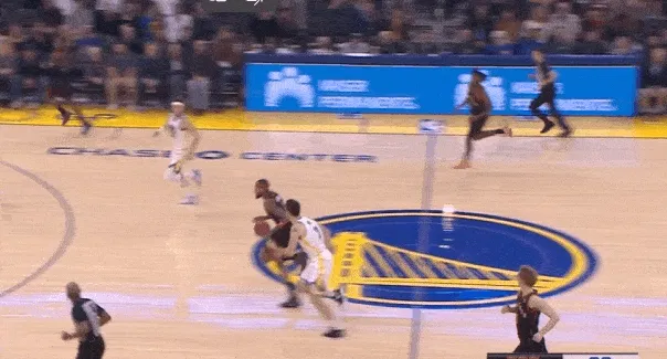 弧顶接巴恩斯击地后立即发动挡拆,借掩护摆脱追防人后压低重心加速突破,行进间挂着回退篮下协防的桑托斯直接起抛投终结打进2+1。